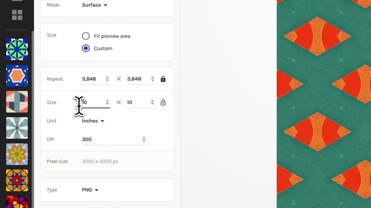 When you use physical units, Repper automatically calculates pixel dimensions based on your size and DPI. A 10×10 inch pattern at 300 DPI becomes a 3000×3000 pixel image.