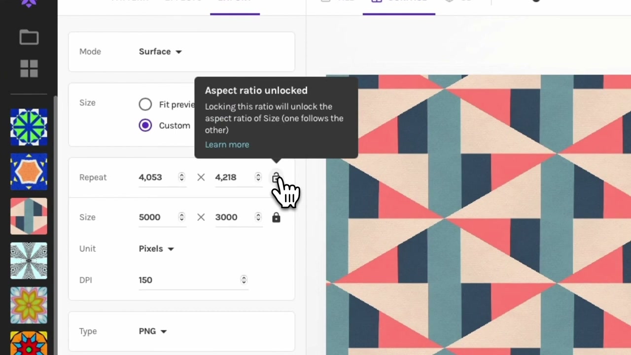 Surface exports show your pattern repeated across a larger area, just like you see in the app most of the time. If you know exactly how you'll use your pattern—printing on fabric as a fat quarter at 150 DPI, for example—surface exports get you what you need in one go. You can set any size and repeat the pattern as much or as little as you want.