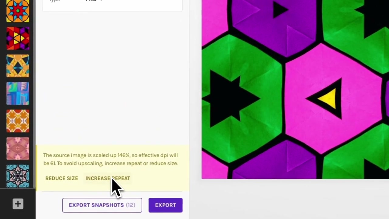 Keep an eye out for upscaling warnings during export. When you see one, Repper offers one-click solutions: keep your export size but increase repeats, or maintain the repeat count but reduce resolution.
